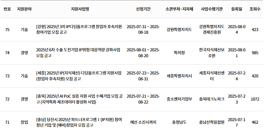 특허청, 중소벤처기업부, 한국발명진흥회, 지역지식재산센터 홈페이지에서 공고문 확인