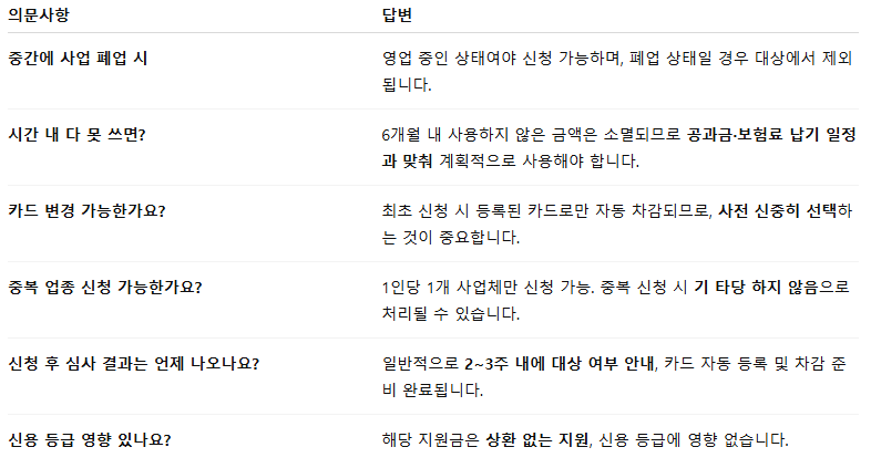 - 꼭 기억하세요: 2025년 5월 1일 이전 개업, 연 매출 3억 이하, 영업 중 업종, 1인 1사업체 신청, 지급일 기준 6개월 사용 등 조건이 필요합니다.