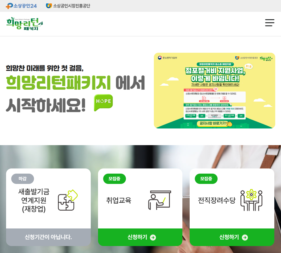 - 온라인 신청: 소상공인시장진흥공단 홈페이지 → 희망리턴패키지 메뉴